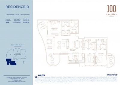 Floor Plan Model Res D, Line D at 100 Las Olas, Fort Lauderdale is 2+Den bedroom, 3 bathroom, Residence unit, with 1,967 ft2 of living area, floor range from 16 to 46, priced upon request, located at 100 E Las Olas Boulevard, Fort Lauderdale FL33301.