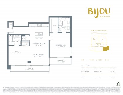 Floor Plan Model 06, Line 06 at Bijou Bay Harbor, Bay Harbor Islands is 1+Den bedroom, 2 bathroom, Residence unit, with 1,069 ft2 of living area, floor range from 5 to 8, priced at $ 644,900 ($ 603 per ft2), located at 9521 E Bay Harbor Drive, Bay Harbor Islands FL33154.