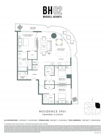Floor Plan Model R3901, Line 01 at Brickell Heights 02, Miami is 3 bedroom, 3,5 bathroom, Residence unit, with 1,443 ft2 of living area, floor range from 39 to 39, priced at $ 745,900 ($ 517 per ft2), located at 850 South Miami Avenue, Miami FL33130.