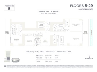 Floor Plan Model B, Line 01 at Elysee, Miami is 3 bedroom, 4,5 bathroom, Residence unit, with 2,727 ft2 of living area, floor range from 8 to 29, priced at $ 1,670,000 ($ 612 per ft2), located at 700 NE 23 ST, Miami FL33137.