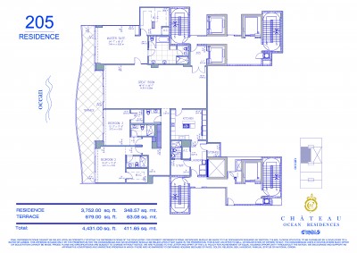 Floor Plan Model 205, Line 05 at FENDI Chateau, Surfside is 3 bedroom, 4,5 bathroom, Residence unit, with 3,752 ft2 of living area, floor range from 2 to 2, priced upon request, located at 9365 Collins Avenue, Surfside FL33154.