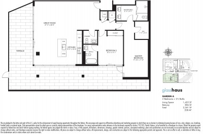 Floor Plan Model GRD A, Line GRD A at Glasshaus in the Grove, Miami is 2 bedroom, 2,5 bathroom, Lanai unit, with 1,435 ft2 of living area, floor range from 1 to 1, priced at $ 800,000 ($ 557 per ft2), located at 3161 Center Street, Miami, FL, Miami FL33133.