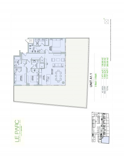 Floor Plan Model A1.1, Line 01 at Le Parc at Brickell, Miami is 3 bedroom, 3 bathroom, Residence unit, with 1,471 ft2 of living area, floor range from 3 to 3, priced at $ 791,900 ($ 538 per ft2), located at 1600 SW 1st Avenue, Miami FL33129.