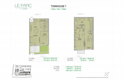 Floor Plan Model TH 7, Line 07 at Le Parc at Brickell, Miami is 2+Den bedroom, 3 bathroom, Townhouse unit, with 1,419 ft2 of living area, floor range from 1 to 2, priced at $ 725,900 ($ 512 per ft2), located at 1600 SW 1st Avenue, Miami FL33129.
