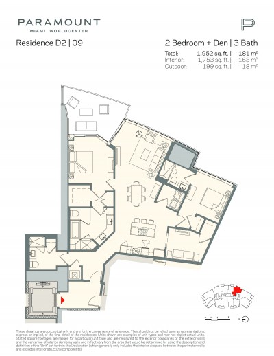 Residence 1109, Model D2, Line 09 at Paramount Miami World Center, Miami is 2+Den bedroom, 3 bathroom unit on 11 floor, with 1,753 ft2 of living area, priced at $ 1,207,000 ($ 689 per ft2), located at 1010 NE 2 ave, Miami FL33132.