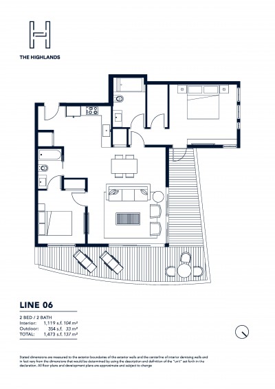 Floor Plan Model 06, Line 06 at THE HIGHLANDS, North Miami is 2 bedroom, 2 bathroom, Residence unit, with 1,119 ft2 of living area, floor range from 1 to 8, priced at $ 438,900 ($ 392 per ft2), located at 13800 Highlands Dr, North Miami FL33126.